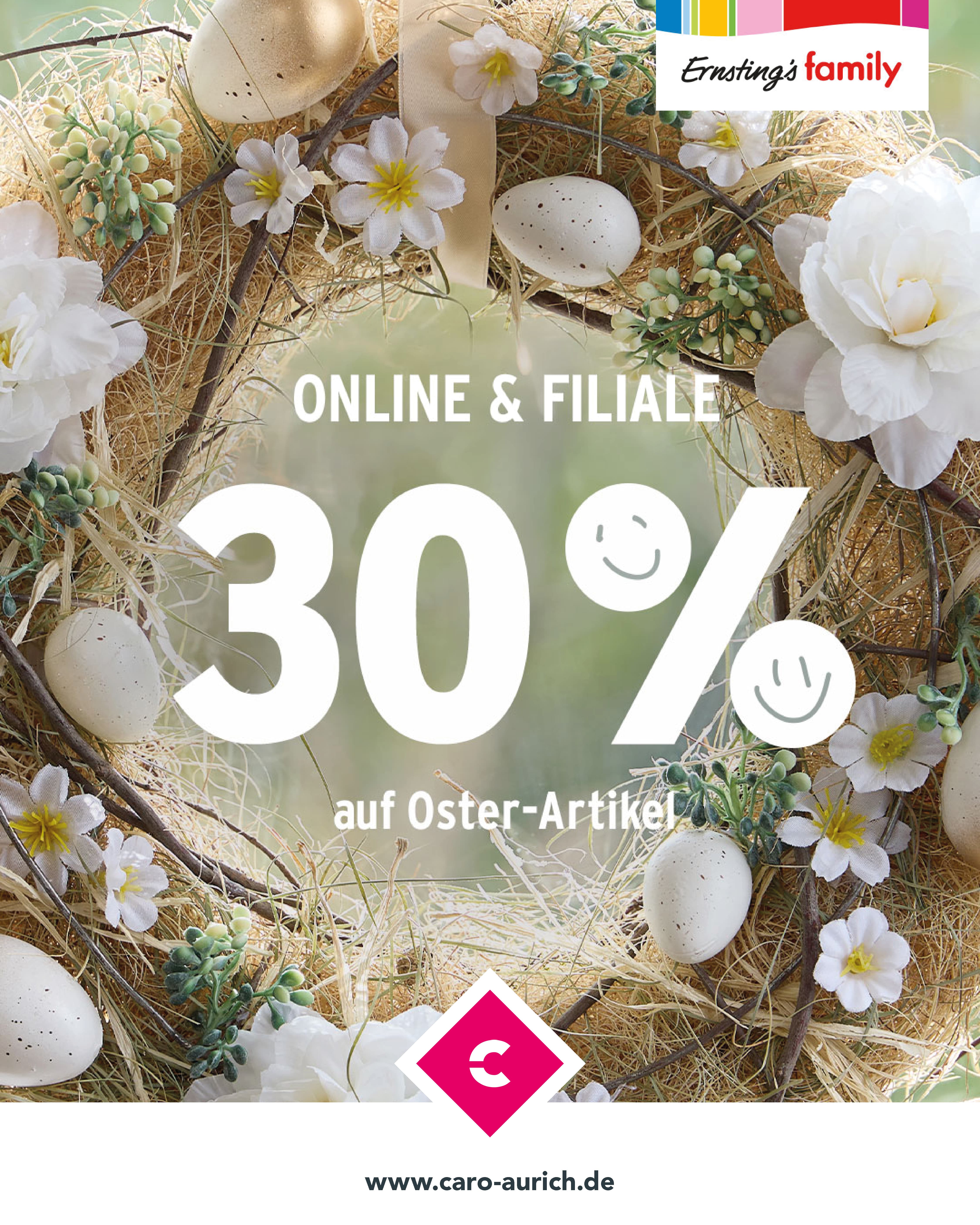 *Der Rabatt gilt vom 12.03. bis 16.03.2026 auf alle Oster-Artikel. GĂŒltig im Online Shop, in der App und in allen Filialen von Ernstingâs family. Online Exklusiv Artikel sind in allen Filialen von Ernsting’s family bestellbar. Der Rabatt gilt nicht fĂŒr Gutscheine, Versandkosten und preisgebundene BĂŒcher. Internetpakete können nicht nachtrĂ€glich bei der Abholung in der Filiale rabattiert werden. Nicht kombinierbar mit anderen (Aktions-)Rabatten. Der Rabatt wird automatisch am Ende des Bezahlvorgangs abgezogen.