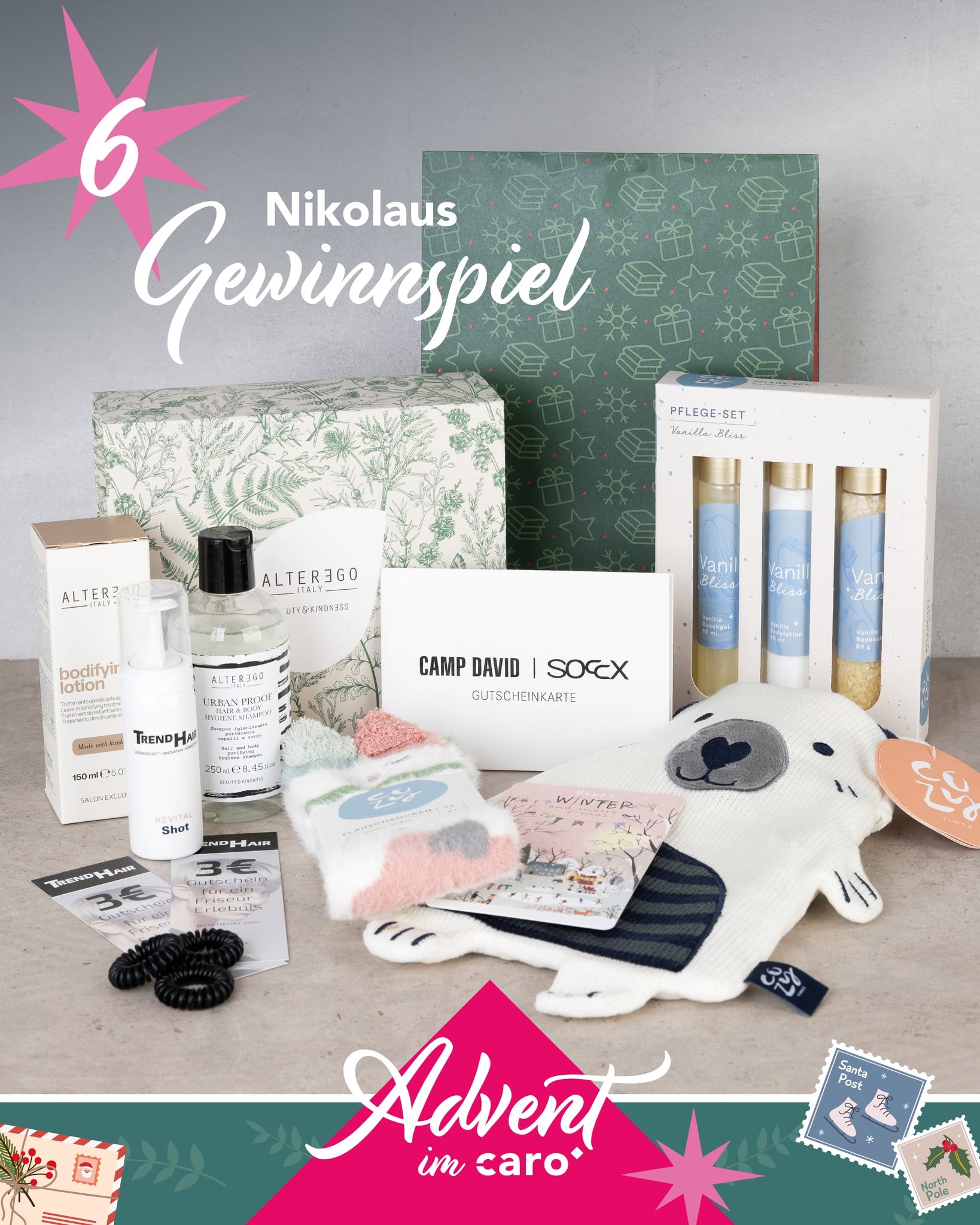 Heute könnt ihr euch auf ein echtes Verwöhnpaket freuen! Zu gewinnen gibt’s ein tolles Bundle mit einem pflegenden Hair-Care-Paket von Trend Hair, einem 20€ Gutschein von Camp David | Soccx und einem entspannenden Spa-Set von Thalia, perfekt für eine kleine Auszeit im Winter! ❄️