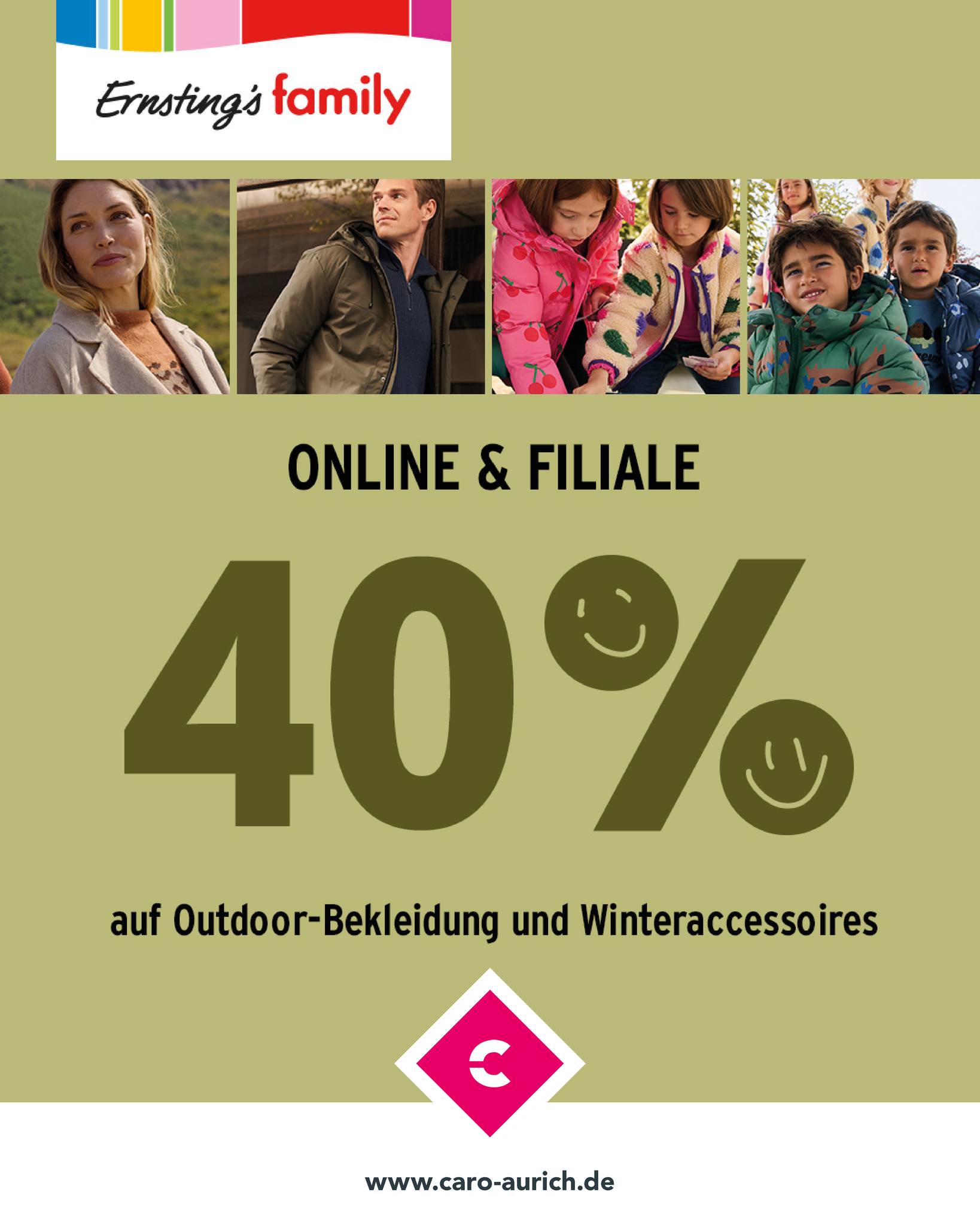 *Der Rabatt gilt vom 12.12. bis 14.12.2025 auf alle Outdoor-Jacken, Regenbekleidung, Schneebekleidung, Westen und winterlichen Accessoires. GĂĽltig im Online Shop, in der App und in allen Filialen von Ernsting’s family. Online Exklusiv Artikel sind in allen Filialen von Ernsting’s family bestellbar. Der Rabatt gilt nicht auf preisgebundene BĂĽcher, Gutscheine und Versandkosten. Internetpakete können nicht nachträglich bei Abholung in der Filiale rabattiert werden. Nicht kombinierbar mit anderen (Aktions-)Rabatten. Der Rabatt wird automatisch am Ende des Bezahlvorgangs abgezogen.