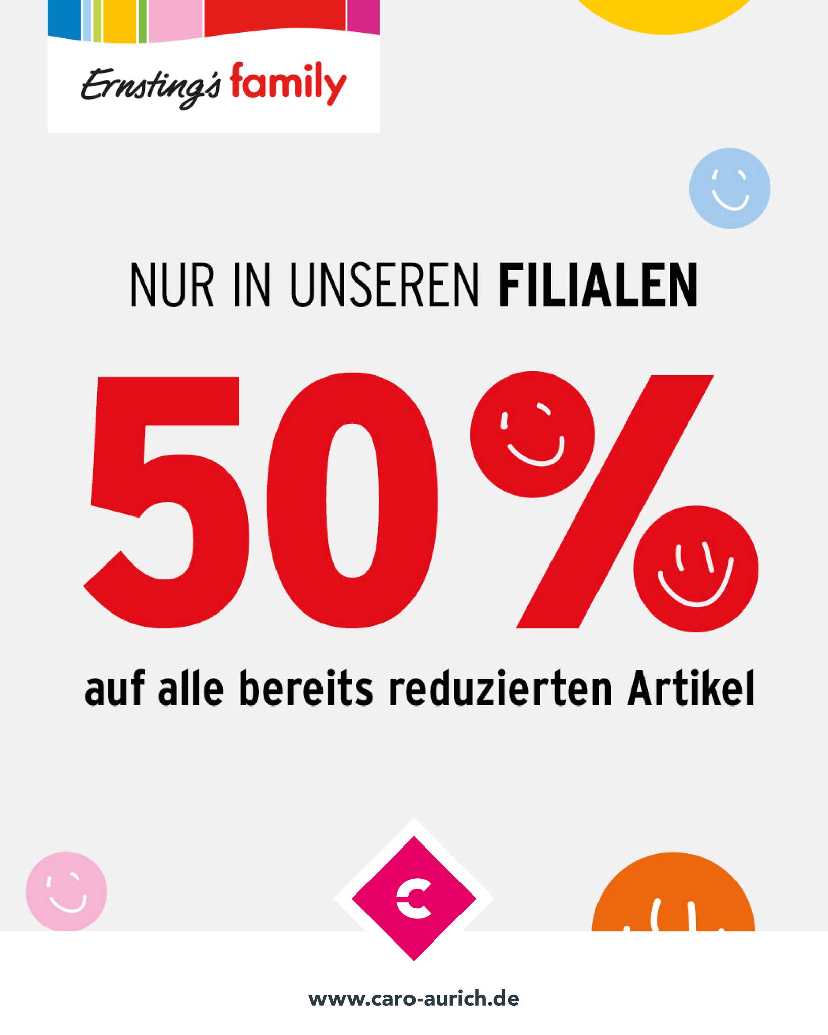 ab heute, den 17.10. gibt es in allen Filialen von Ernstingâs family, also auch bei uns im caro, 50 % auf alle bereits reduzierten Artikel. Die Aktion gilt bis einschlieĂlich 18.10.2025*.